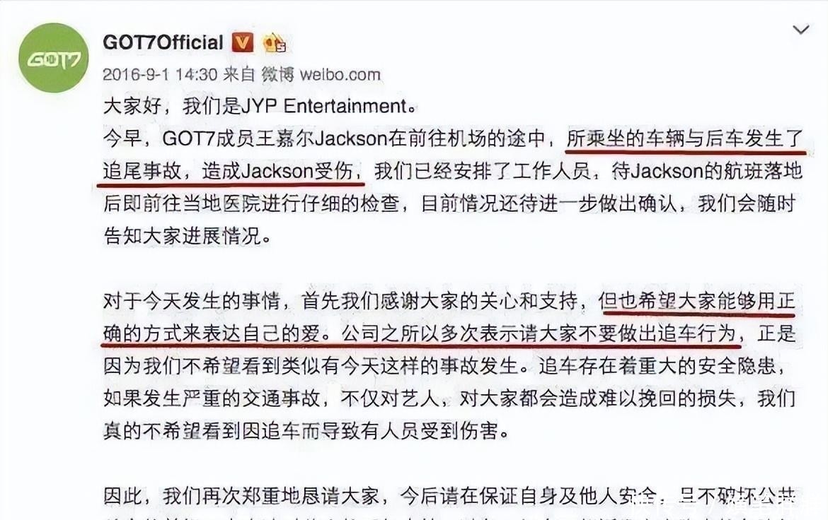 但王嘉尔就惨了,他乘坐的车辆被私生追尾,导致他腰部受伤,他公开发文谴责,要追究私生的责任,后续不得不加强安保。